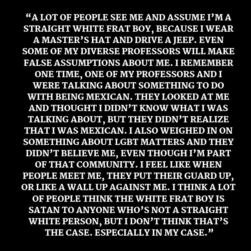 Leading up to Diversity & Inclusion Week, the committee started an Instagram account to highlight stories which captured student experiences in scenarios having to do with their identities. These posts conveyed how students of various backgrounds navigated assumptions, biases, and all of the collegiate trials coming from their unique perspective. The above is an example of one of the submissions.