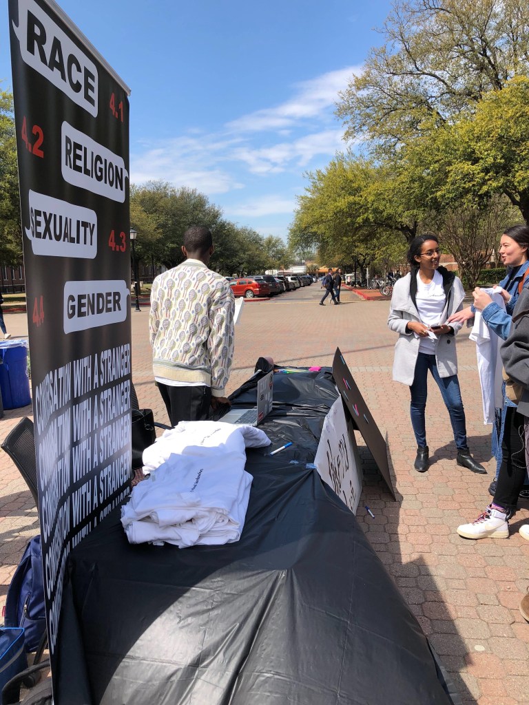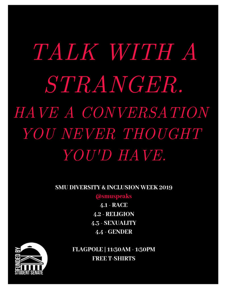 The concept for the 2019 D&I week was simple. It was born out of clear societal divides and polarization (the usual: race, class, gender, sexual orientation, etc.) which were apparent on SMU’s PWI campus. Paired with a rocky political climate, Naomi figured it wasn’t appropriate to hold the usual celebratory, multicultural programming. It was time for something less common, and much simpler: dialogue. Human connection. And so, April 1st marked the beginning of a week with conversations around Race, Religion, Sexuality, and Gender.